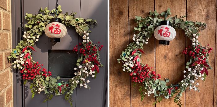 左 玄関に吊ったもの ちょっと不細工なので後で庭からユーカリとってきて直します。